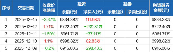 天元智能:融资净买入111.98万元,融资余额6834.38万元(12-15)