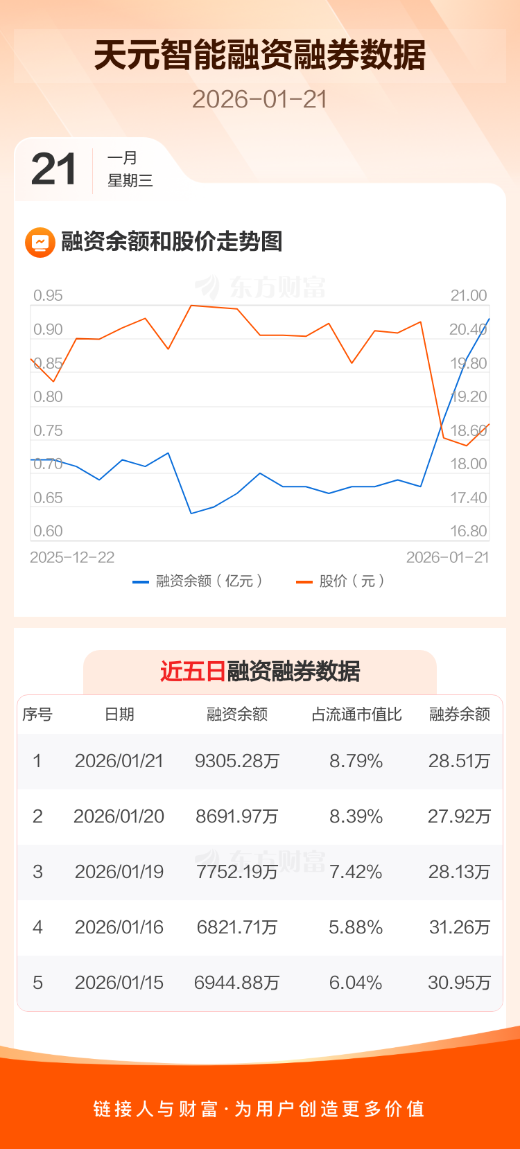 交易所最新数据显示,天元智能于2026年1月21日获融资买入1444.30万元,融资偿还830.99万元,当日融资净买入613.31万元。目前,该股融资余额9305.28万,占流通市值比例为8.79%。