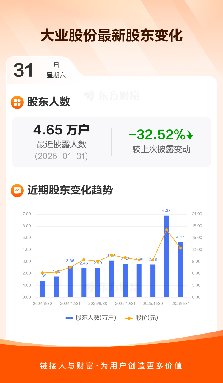 大业股份:截至1月31日最新股东户数4.65万户,较上期减少32.52%