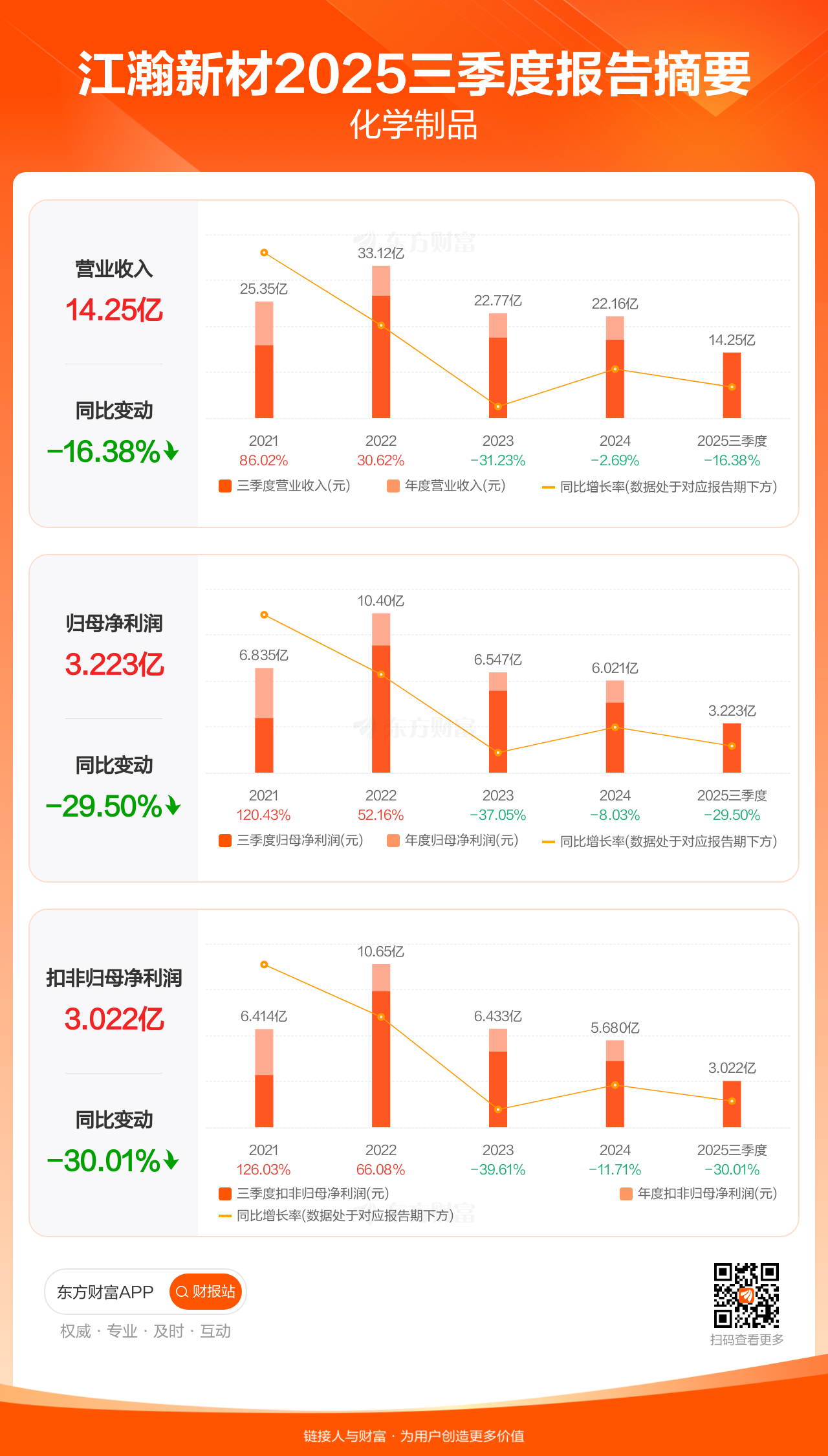 江瀚新材10月28日发布2025年三季报显示,公司前三季实现营业收入14.25亿元,同比下滑16.38%;归母净利润3.22亿元,同比下滑29.50%;扣非归母净利润3.02亿元,同比下滑30.01%。
