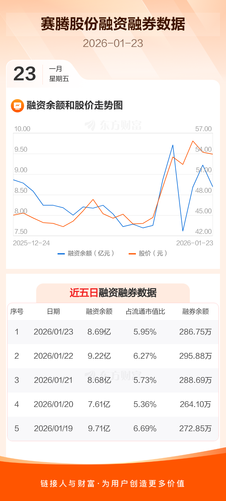 交易所最新数据显示,赛腾股份于2026年1月23日获融资买入1.57亿元,融资偿还2.09亿元,当日融资净偿还5222.97万元。目前,该股融资余额8.69亿,占流通市值比例为5.95%。