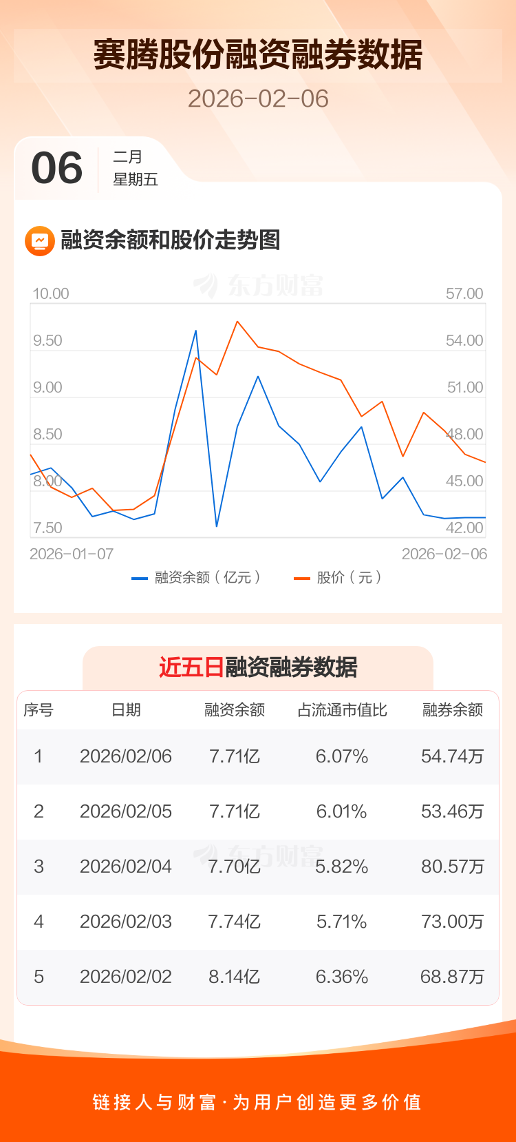 交易所最新数据显示,赛腾股份于2026年2月6日获融资买入3600.84万元,融资偿还3590.17万元,当日融资净买入10.68万元。目前,该股融资余额7.71亿,占流通市值比例为6.07%。