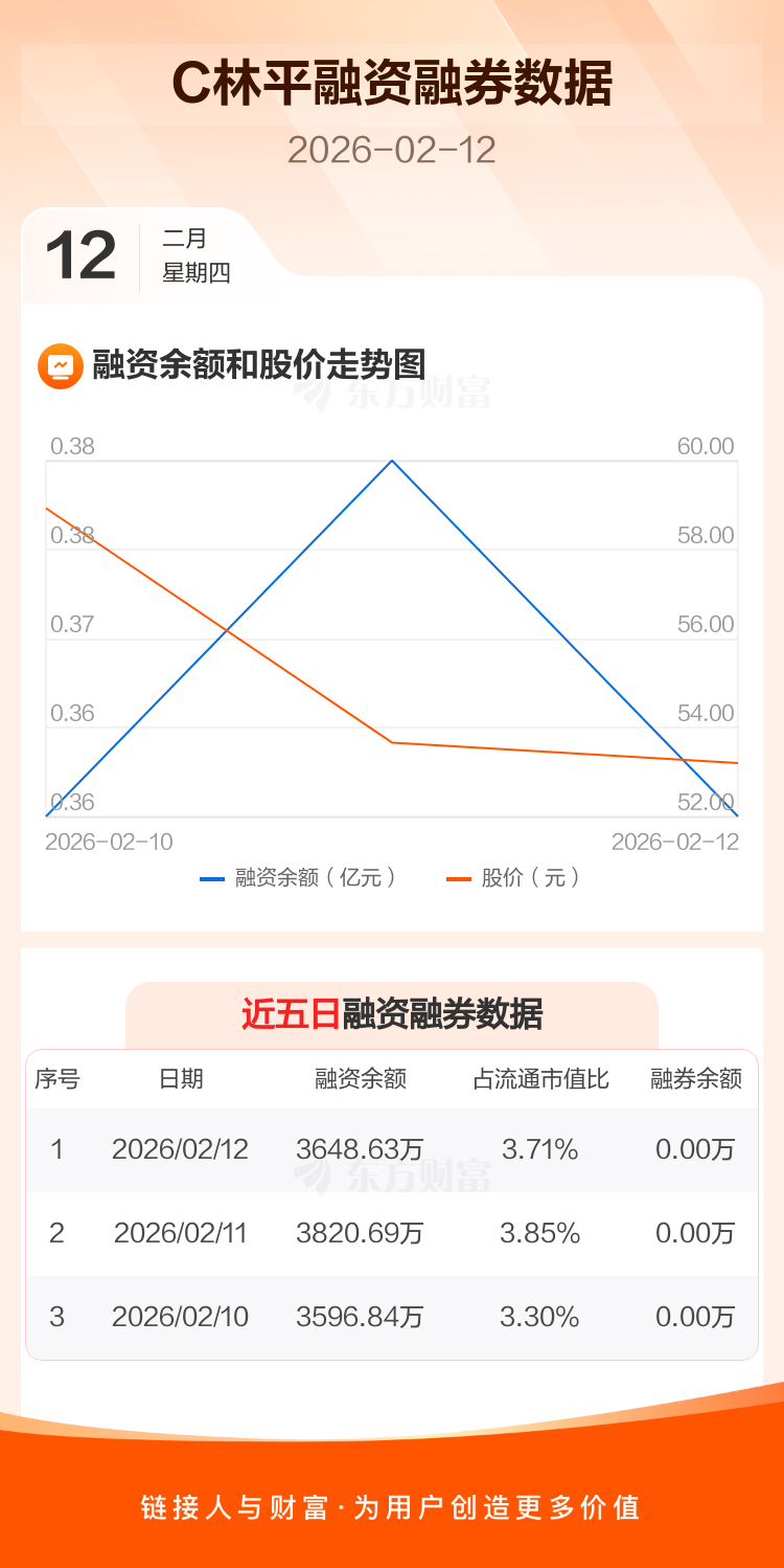 交易所最新数据显示,C林平于2026年2月12日获融资买入2067.48万元,融资偿还2239.55万元,当日融资净偿还172.07万元。目前,该股融资余额3648.63万,占流通市值比例为3.71%。