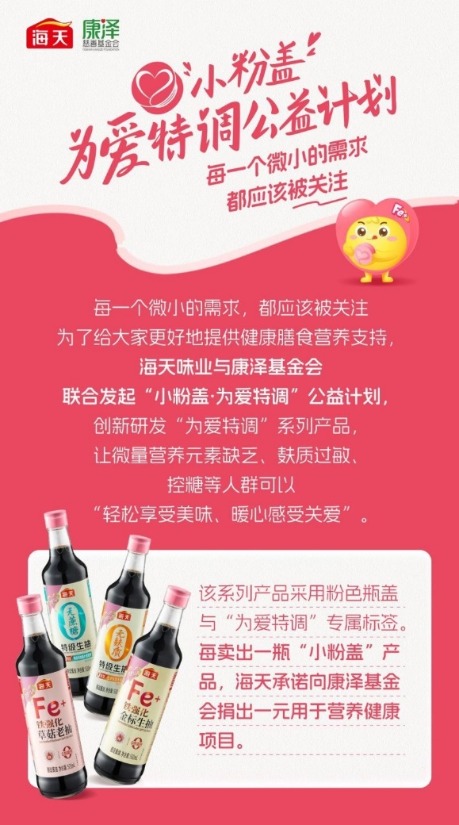 二十余年间,海天累计售出铁强化酱油约1.4亿瓶,惠及超2300万人。秉持“每一个微小的需求,都应当被关注”的理念,海天主动倾听特殊人群的真实需求,不断在产品上做“加法”和“减法”,从最初的铁强化酱油,延伸至包括铁强化、无麸质、无蔗糖、富硒减盐等多功能的产品,升级为系统性的“小粉盖·为爱特调”产品系列,精准覆盖微量营养元素缺乏、麸质过敏、控盐控糖等特殊人群。此外,海天还承诺,每售出一瓶小粉盖产品,便捐出一元用于公益。
