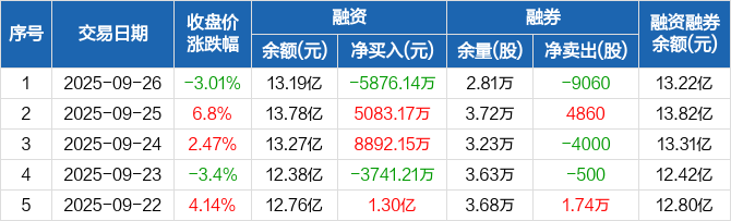 华勤技术:融资净偿还5876.14万元,融资余额13.19亿元(09-26)