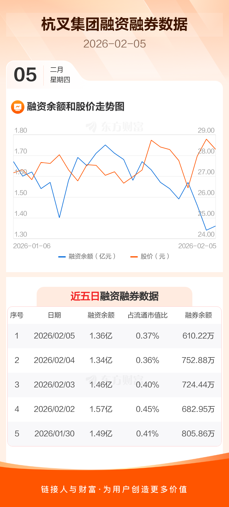 交易所最新数据显示,杭叉集团于2026年2月5日获融资买入1045.44万元,融资偿还892.59万元,当日融资净买入152.85万元。目前,该股融资余额1.36亿,占流通市值比例为0.37%。