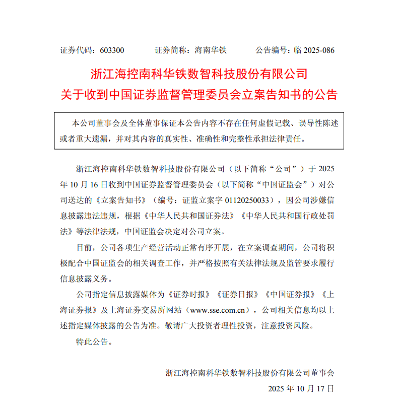 海南华铁:涉嫌信息披露违法违规 被中国证监会立案调查