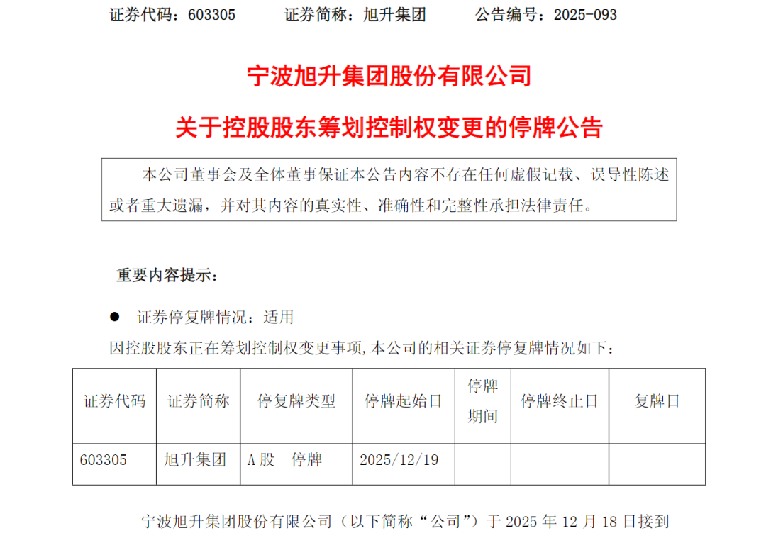 12月18日晚间,旭升集团(603305)发布公告称,接到控股股东、实控人徐旭东通知,徐旭东及其一致行动人正在筹划涉及所持有公司股份转让事宜,可能导致公司控制权变更。为避免对公司股价造成重大影响,公司股票自2025年12月19日起停牌,预计停牌时间不超过2个交易日。
