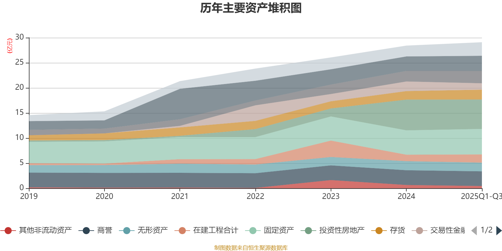 资产重大变化方面,截至2025年三季度末,公司交易性金融资产合计较上年末减少33.52%,占公司总资产比重下降2.38个百分点;投资性房地产较上年末减少4.54%,占公司总资产比重下降1.45个百分点;在建工程合计较上年末增加26.95%,占公司总资产比重上升1.09个百分点;应收票据及应收账款较上年末增加17.23%,占公司总资产比重上升1.07个百分点。