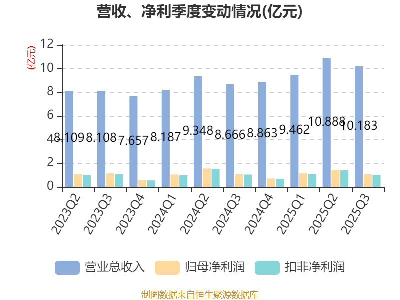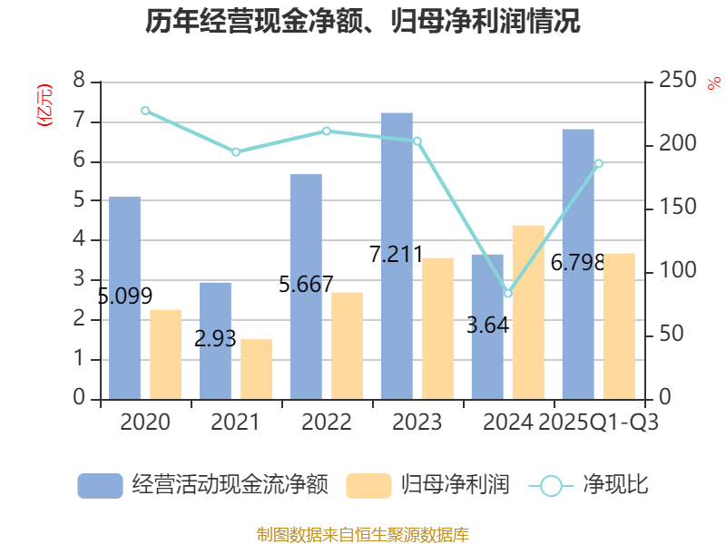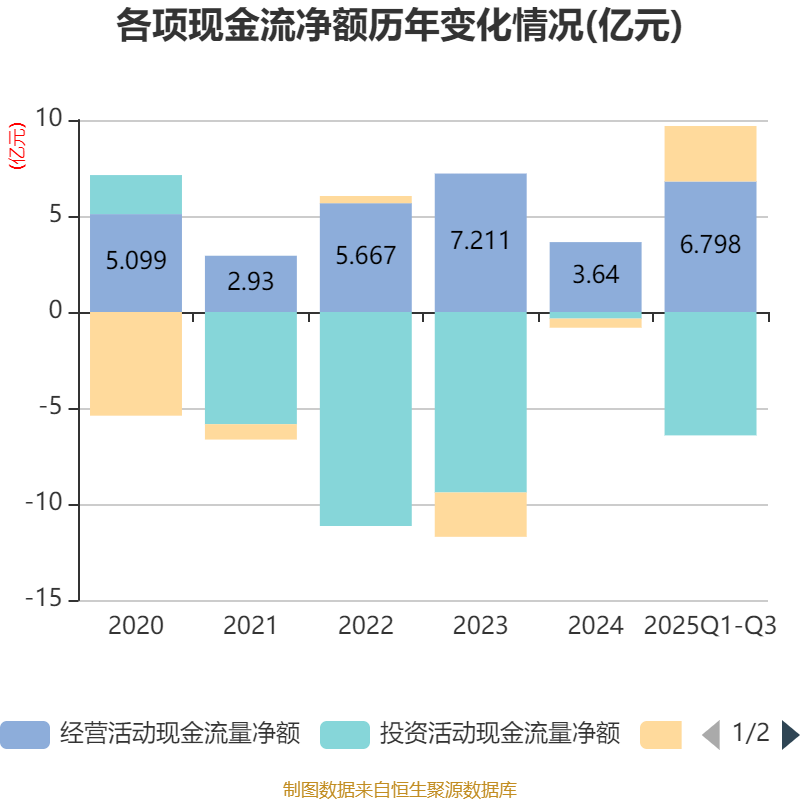 2025年前三季度,公司经营活动现金流净额为6.8亿元,同比增长107.2%;筹资活动现金流净额2.89亿元,同比增加2.63亿元;投资活动现金流净额-6.43亿元,上年同期为-151万元。
