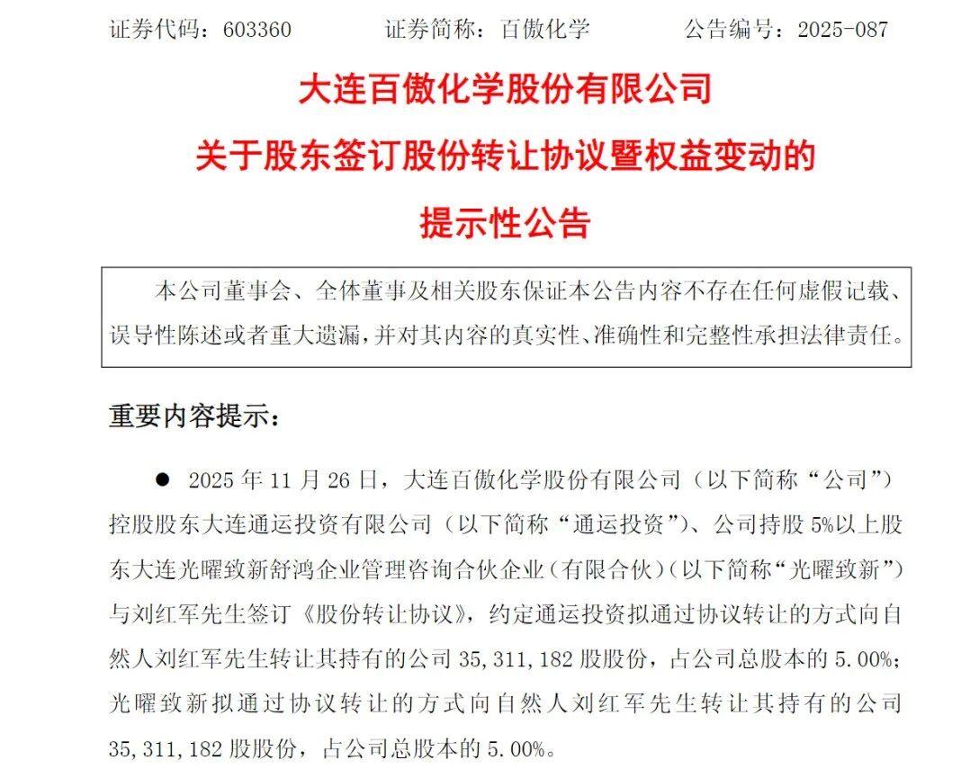 11月26日晚,百傲化学(603360)披露,控股股东大连通运投资有限公司(简称“通运投资”)、持股5%以上股东大连光曜致新舒鸿企业管理咨询合伙企业(有限合伙)(简称“光曜致新”)合计转让公司总股本的10%给刘红军。转让价格为每股28.116元,总对价为19.86亿元。转让前刘红军未持有公司股份,转让后持有10%股份。