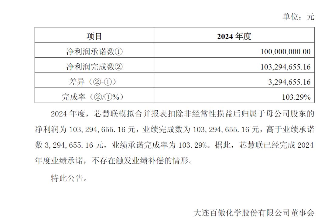 芯慧联2024年度业绩承诺完成情况