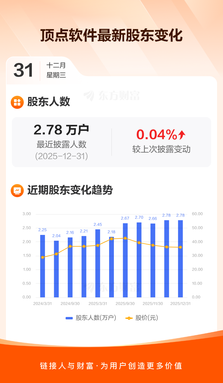 顶点软件:截至12月31日最新股东户数2.78万户,较上期增加0.04%