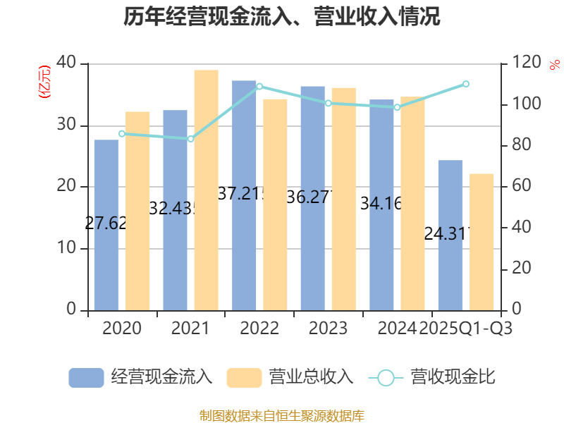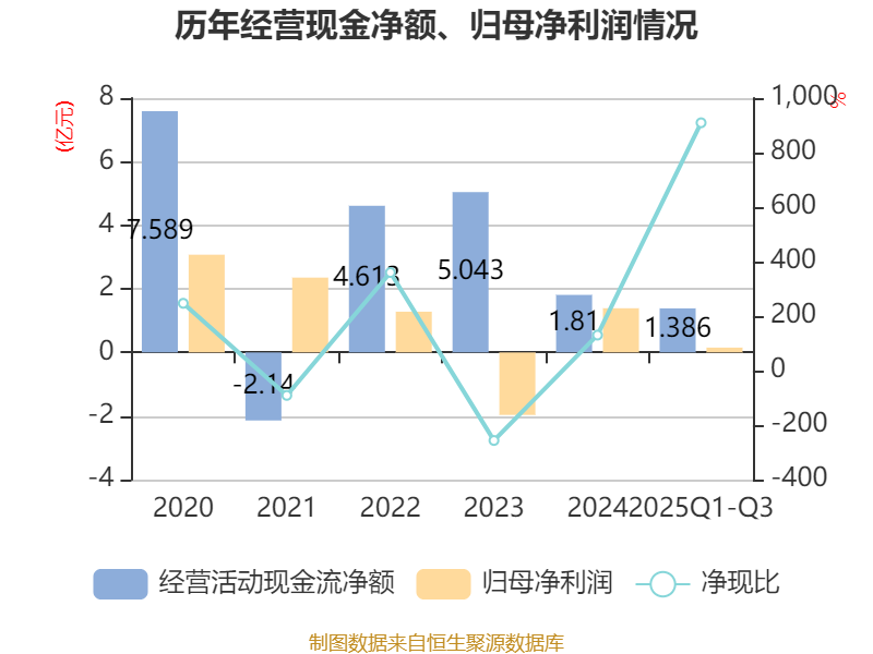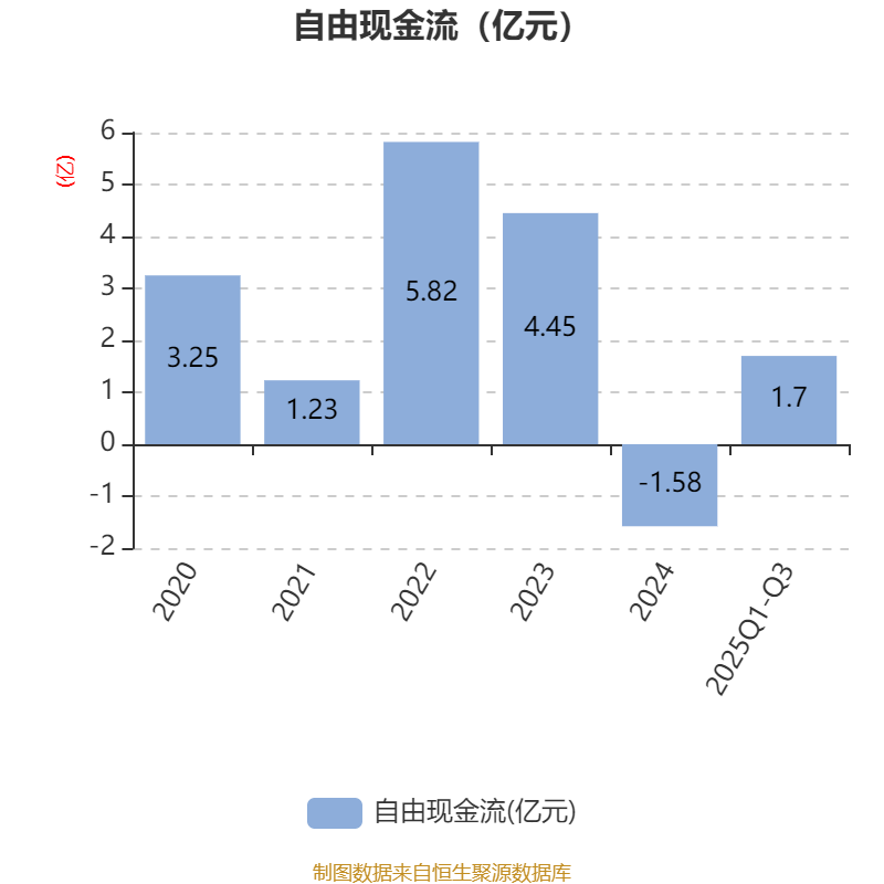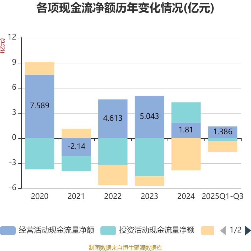 2025年前三季度,公司经营活动现金流净额为1.39亿元,同比下降33.4%;筹资活动现金流净额-1.28亿元,同比减少879.11万元;投资活动现金流净额-3733.56万元,上年同期为2.91亿元。