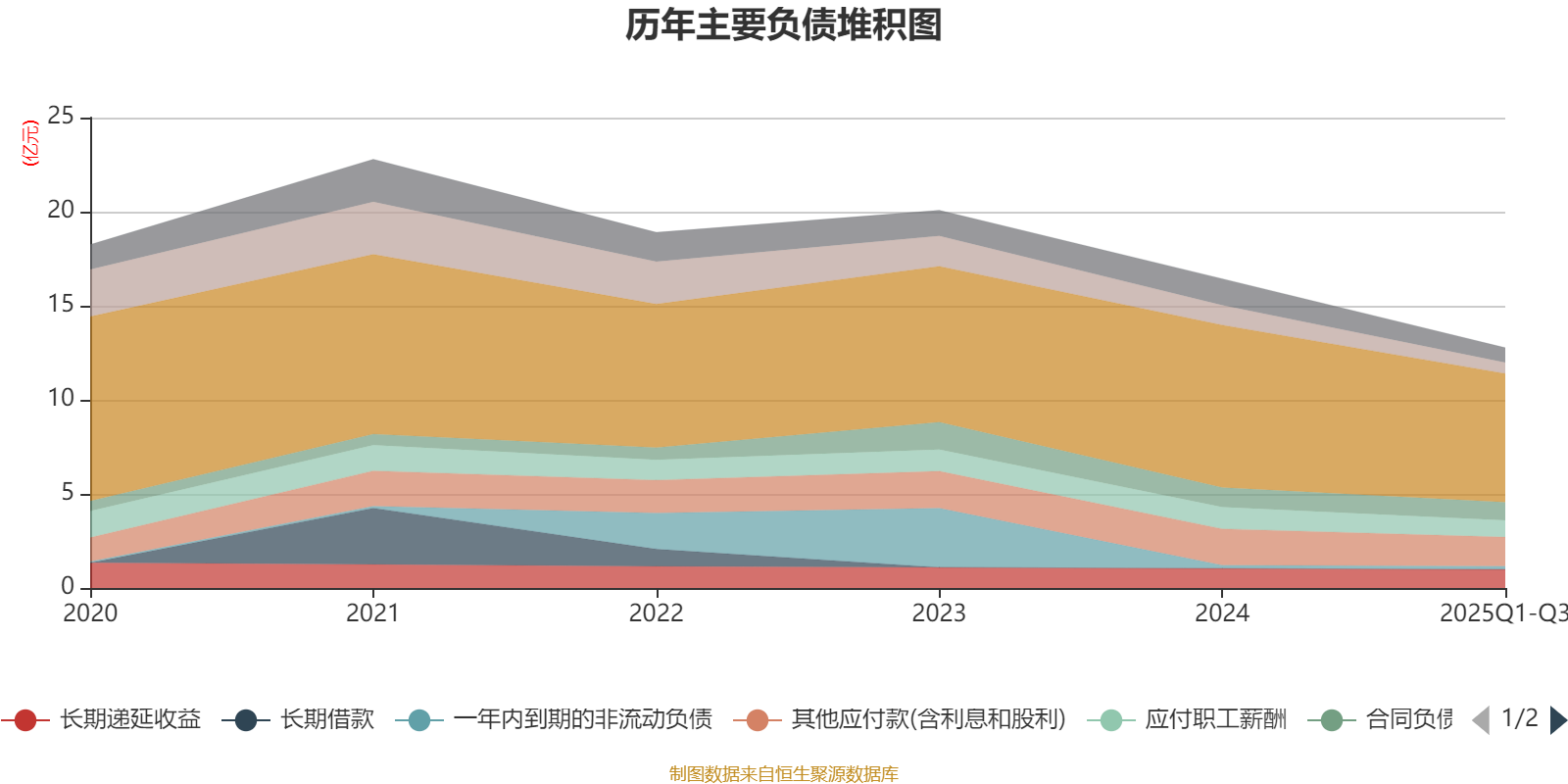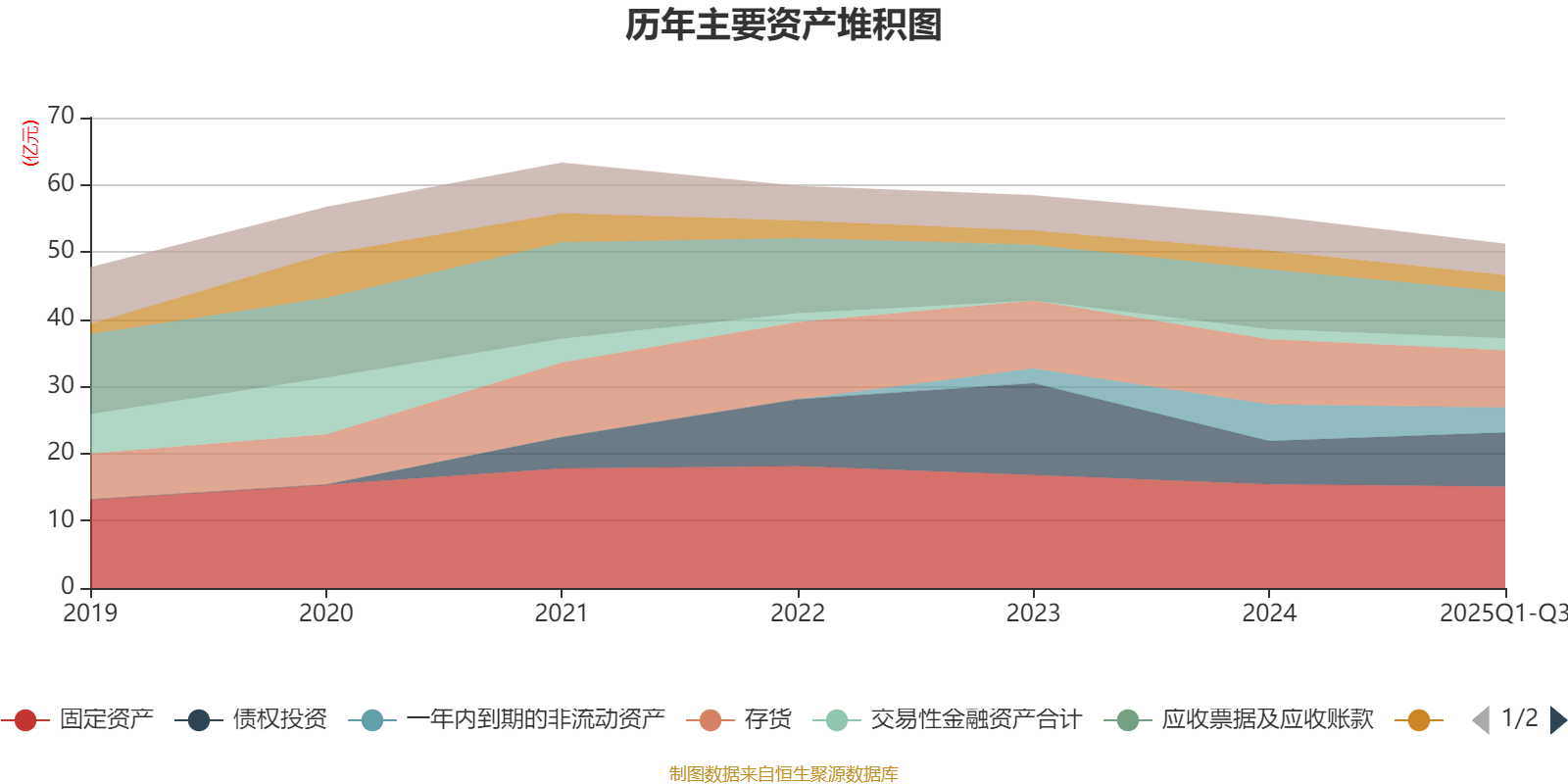 资产重大变化方面,截至2025年三季度末,公司债权投资较上年末增加25.11%,占公司总资产比重上升4.1个百分点;一年内到期的非流动资产较上年末减少31.98%,占公司总资产比重下降2.6个百分点;应收票据及应收账款较上年末减少22.4%,占公司总资产比重下降2.59个百分点;固定资产较上年末减少2.26%,占公司总资产比重上升1.57个百分点。