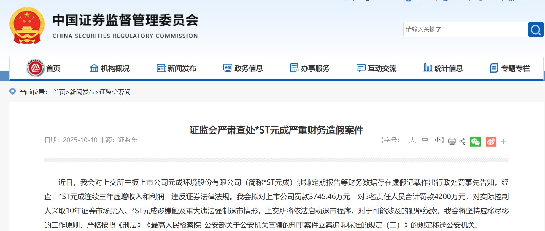 据证监会官网10月10日消息,近日,证监会对上交所主板上市公司元成环境股份有限公司(简称*ST元成)涉嫌定期报告等财务数据存在虚假记载作出行政处罚事先告知。