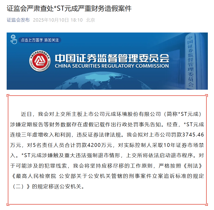 经查,*ST元成连续三年虚增收入和利润,违反证券法律法规。中国证监会拟对上市公司罚款3745.46万元,对5名责任人员合计罚款4200万元,对实际控制人采取10年证券市场禁入。*ST元成涉嫌触及重大违法强制退市情形,上交所将依法启动退市程序。
