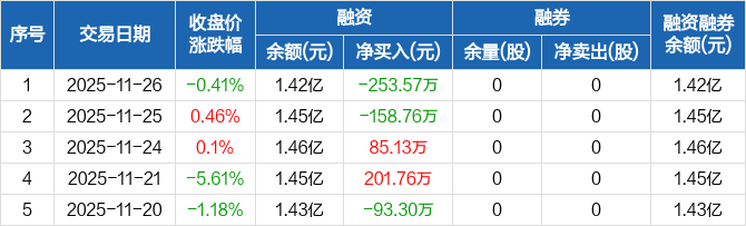 天富龙:融资净偿还253.57万元,融资余额1.42亿元(11-26)