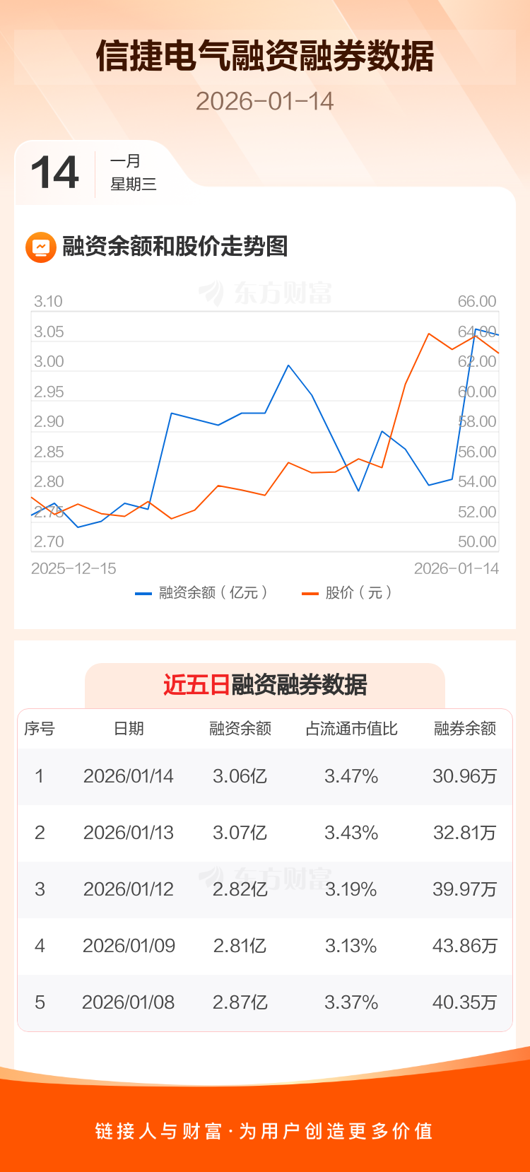 交易所最新数据显示,信捷电气于2026年1月14日获融资买入5071.34万元,融资偿还5212.86万元,当日融资净偿还141.51万元。目前,该股融资余额3.06亿,占流通市值比例为3.47%。