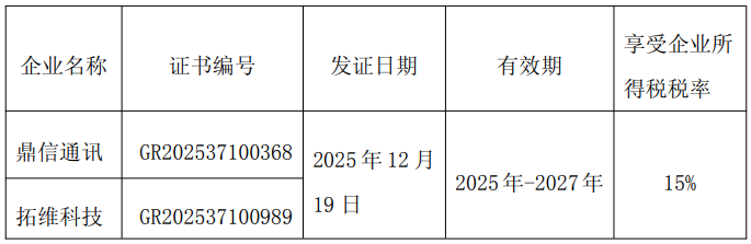 鼎信通讯及子公司获高新技术企业认定 享15%税率优惠