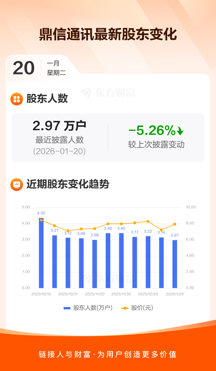 鼎信通讯最新披露数据显示,截至1月20日公司股东户数为2.97万户,较上期(2026年1月10日)减少1650户,降幅为5.26%。户均持有流通股数量由上期的2.08万股上升至2.19万股,户均持股金额由上期的14.99万元增加至17.38万元。