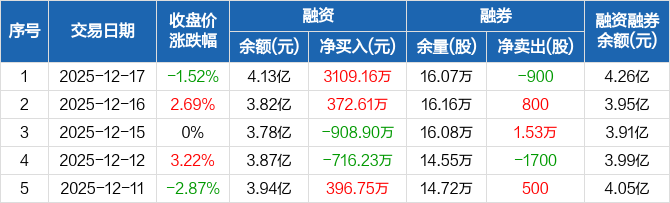 融资方面,当日融资买入7756.7万元,融资偿还4647.53万元,融资净买入3109.16万元。融券方面,融券卖出500股,融券偿还1400股,融券余量16.07万股,融券余额1293.31万元。融资融券余额合计4.26亿元。