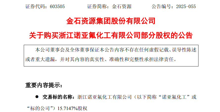 金石资源表示,此次对外投资购买股权,旨在依托公司上游萤石矿以及氟化工基础产品的核心优势,布局具有高增长潜力的精细氟化工赛道,拓展新质业务。
