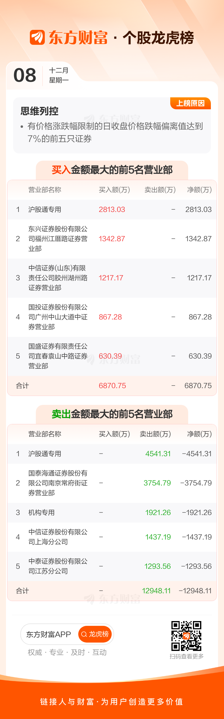 交易所2025年12月8日公布的交易公开信息显示,思维列控因成为有价格涨跌幅限制的日收盘价格跌幅偏离值达到7%的前五只证券上榜。思维列控当日收报29.34元,涨跌幅-7.39%,偏离值-7.93%,换手率5.97%,成交额6.76亿。