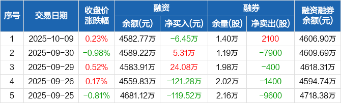 欧普照明:融资净偿还6.45万元,融资余额4582.77万元(10-09)