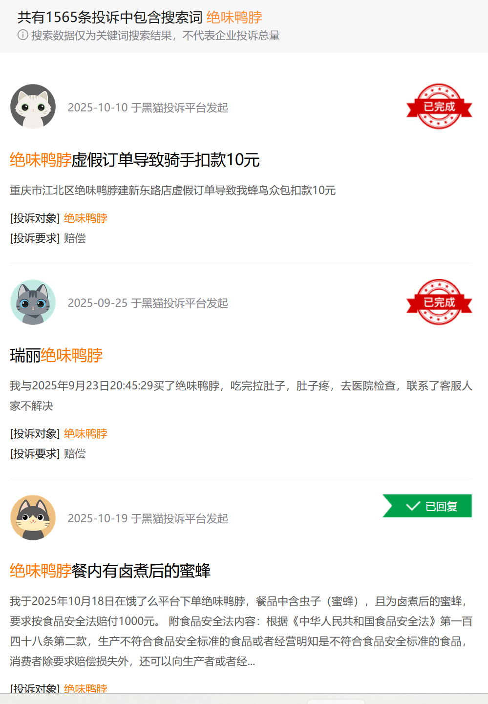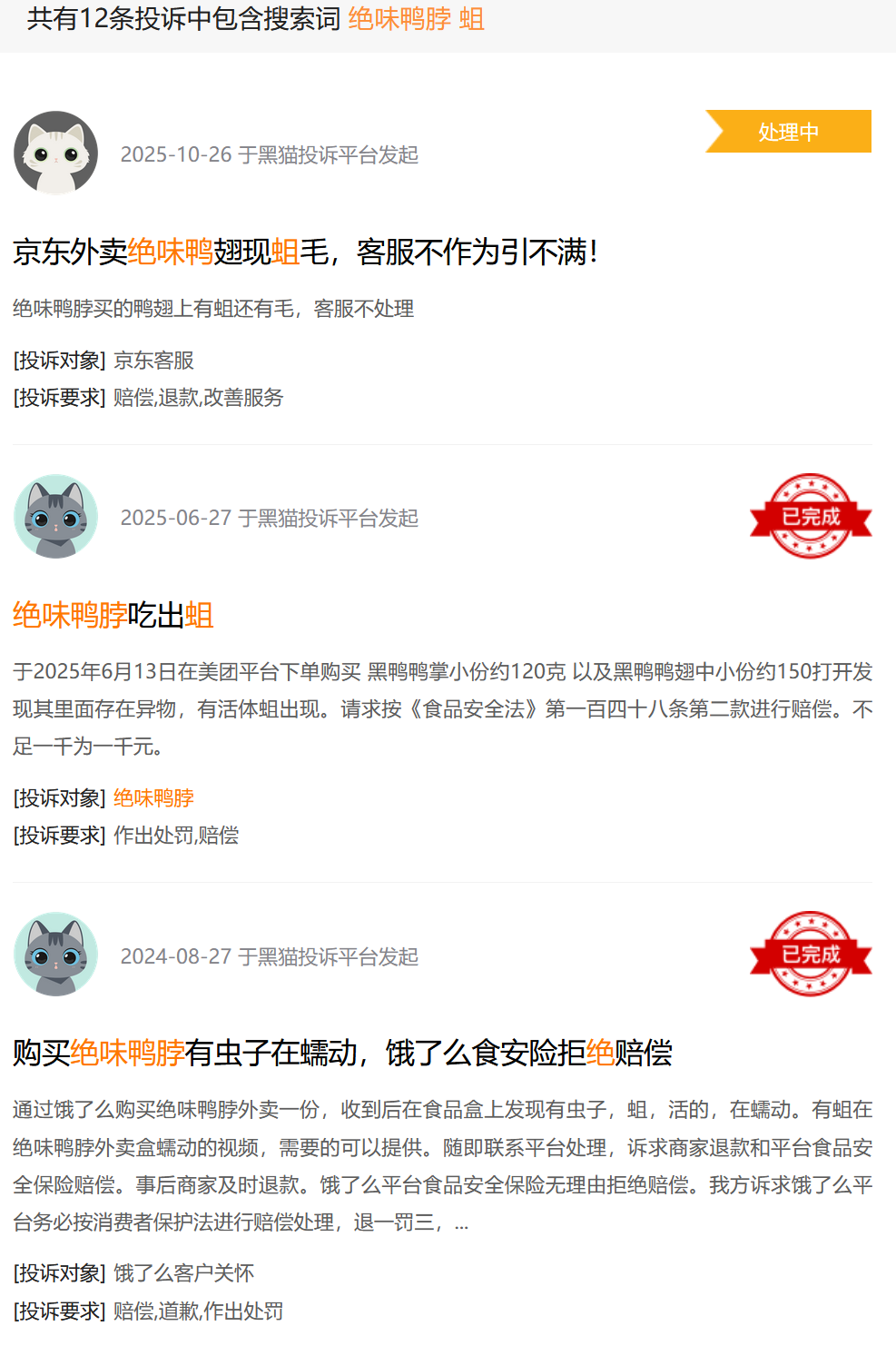 这种敌意正在投诉平台集中爆发。黑猫平台上关于绝味的投诉累计已超1560条,完成率不足八成,其中食品质量与安全问题占比过半。消费者反映鸭脖“存在异味不新鲜”,还有人吃出“被煮过的昆虫”。这些真实案例,与计量单位的小动作一起,把信任撕开了一个又一个口子。