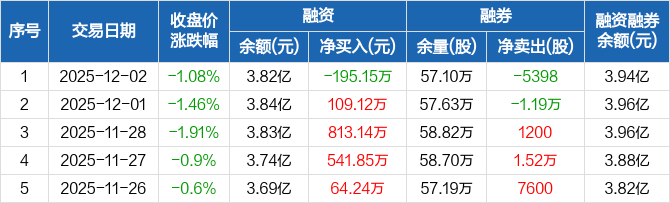 伟明环保:融资净偿还195.15万元,融资余额3.82亿元(12-02)