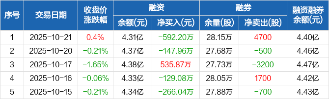 口子窖:融资余额4.31亿元,创近一年新低(10-21)