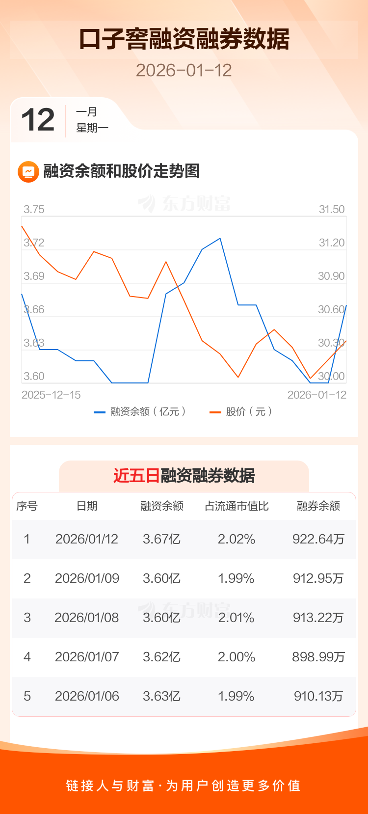 交易所最新数据显示,口子窖于2026年1月12日获融资买入1945.95万元,融资偿还1262.64万元,当日融资净买入683.31万元。目前,该股融资余额3.67亿,占流通市值比例为2.02%。