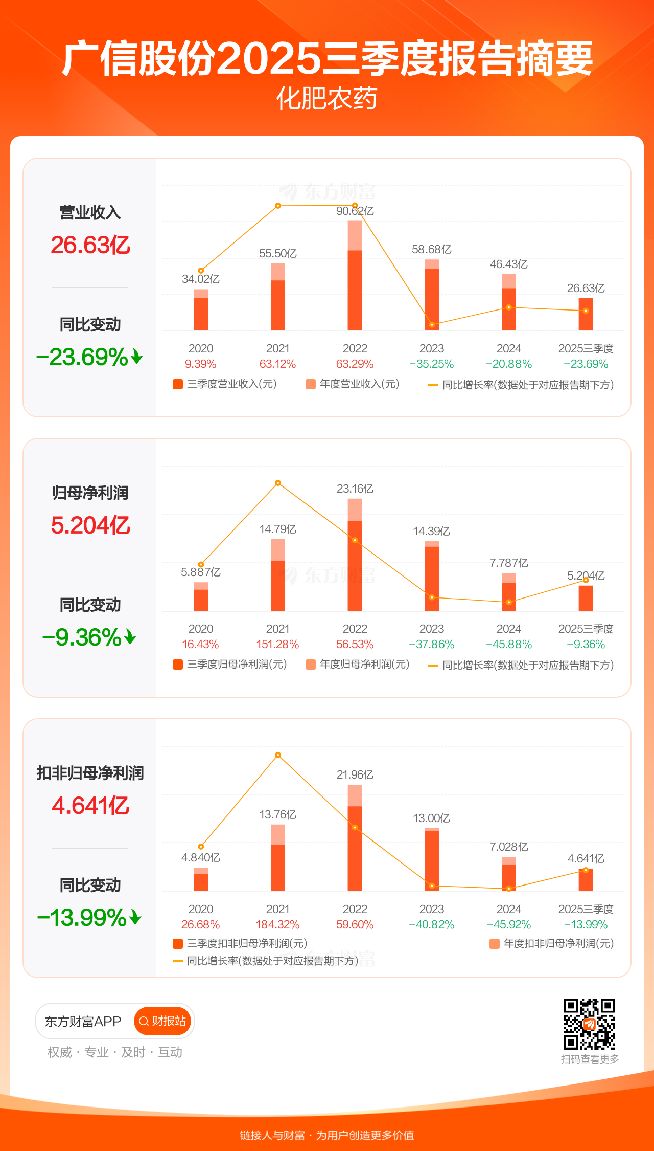 广信股份10月28日发布2025年三季报显示,公司前三季实现营业收入26.63亿元,同比下滑23.69%;归母净利润5.20亿元,同比下滑9.36%;扣非归母净利润4.64亿元,同比下滑13.99%。