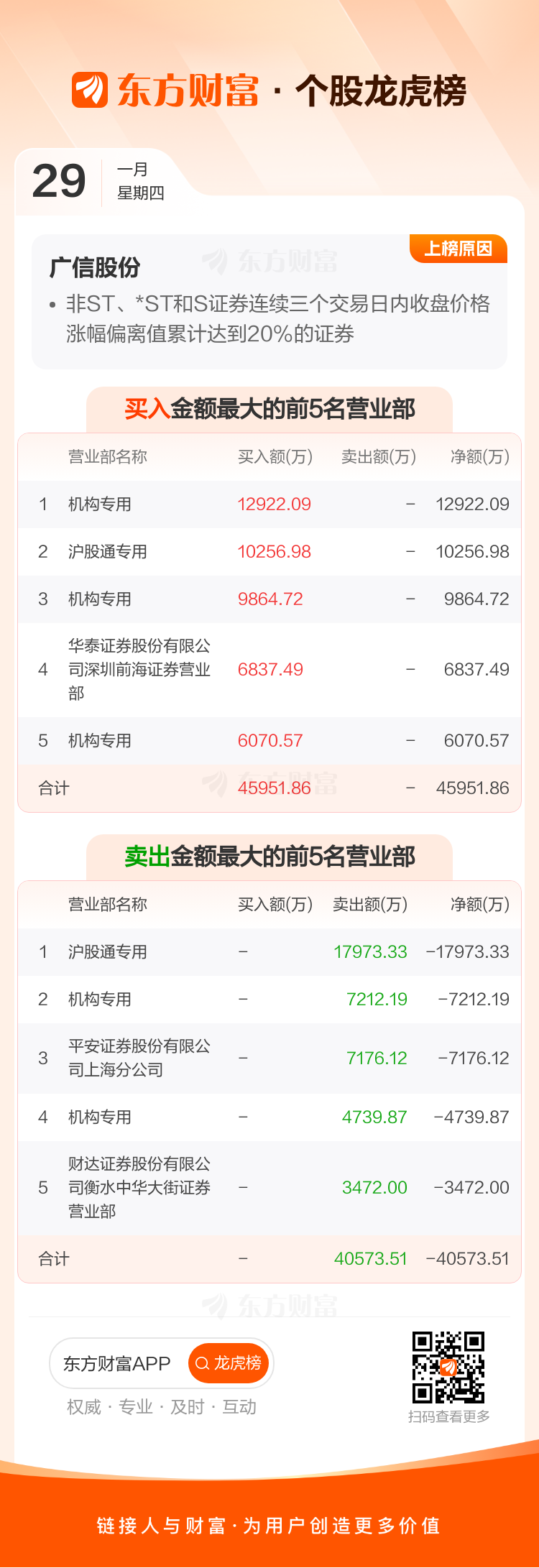交易所2026年1月29日公布的交易公开信息显示,广信股份因成为非ST、*ST和S证券连续三个交易日内收盘价格涨幅偏离值累计达到20%的证券上榜。广信股份当日收报15.5元,涨跌幅10.01%,换手率8.56%,成交额11.56亿。异常期间1月28日至1月29日,期间涨幅20.62%,累计偏离值20.18%,区间成交额18.80亿。