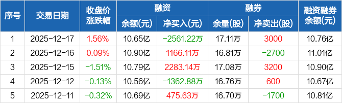 珀莱雅融资融券信息显示,2025年12月17日融资净偿还2561.22万元;融资余额10.65亿元,较前一日下降2.35%。