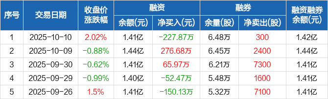 禾丰股份:融资净偿还227.87万元,融资余额1.41亿元(10-10)