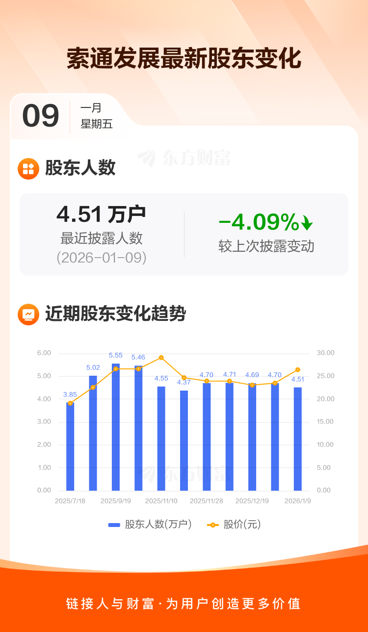 索通发展:截至1月9日最新股东户数4.51万户,较上期减少4.09%