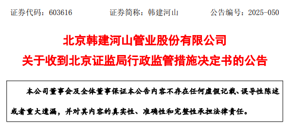 9月25日晚间, 韩建河山( 603616)公告称,公司以及董事长兼总经理田玉波等相关责任人员因存在多项违规行为,被北京证监局采取出具警示函的行政监管措施,并记入资本市场诚信档案。