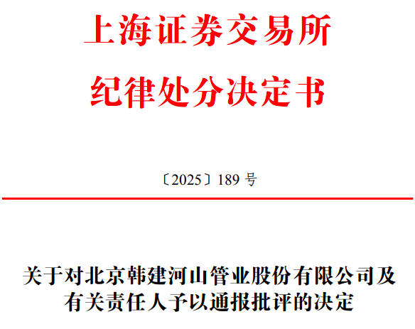 根据《股票上市规则(2025年4月修订)》第 13.2.1 条、第 13.2.3 条和《上海证券交易所纪律处分和监管措施实施办法》《上海证券交易所上市公司自律监管指引第 10 号——纪律处分实施标准》等有关规定,上交所作出如下纪律处分决定: 对北京韩建河山管业股份有限公司、时任董事长兼总裁田玉波、时任财务总监张海峰、魏良彬、时任董事会秘书孙雪予以通报批评。