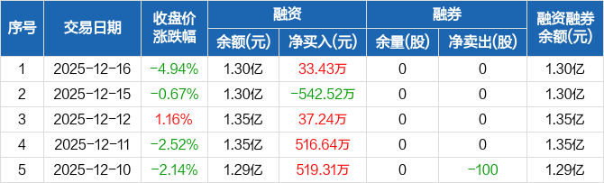 融资方面,当日融资买入1890.38万元,融资偿还1856.96万元,融资净买入33.43万元。融券方面,融券卖出0股,融券偿还0股,融券余量0股,融券余额0元。融资融券余额合计1.3亿元。