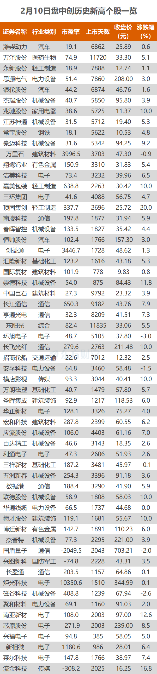 2月10日,A股三大指数今日震荡整理,截止收盘,沪指涨0.13%,收报4128.37点;深证成指涨0.02%,收报14210.63点;创业板指跌0.37%,收报3320.54点。东方财富Choice数据显示,今日有59只个股盘中股价创历史新高,分别为五洲新春、数据港等。
