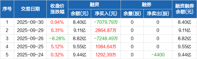天马科技:融资净偿还7079.79万元,融资余额8.4亿元(09-30)