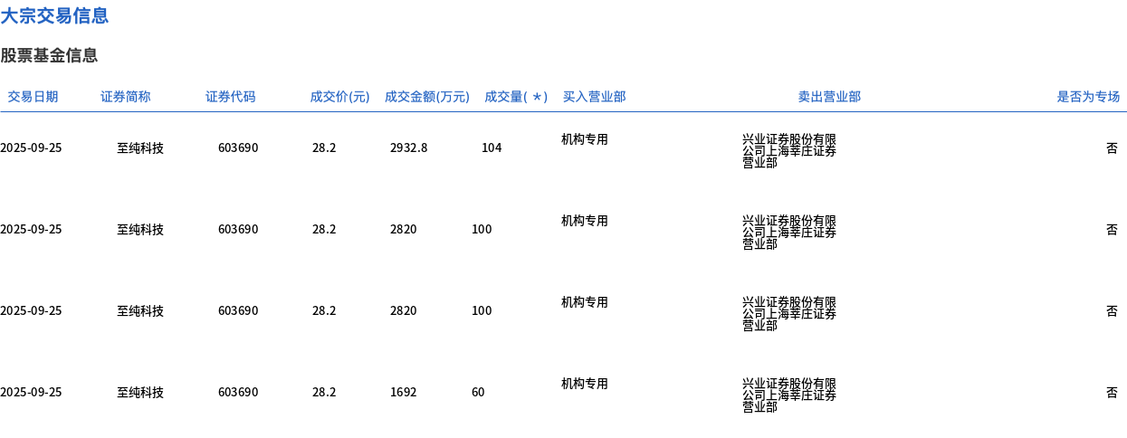 至纯科技今日大宗交易折价成交364万股,成交额1.03亿元