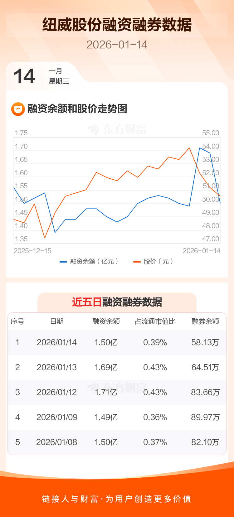 交易所最新数据显示,纽威股份于2026年1月14日获融资买入1733.77万元,融资偿还3644.90万元,当日融资净偿还1911.13万元。目前,该股融资余额1.50亿,占流通市值比例为0.39%。