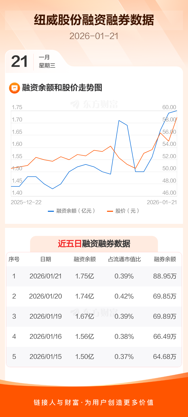 交易所最新数据显示,纽威股份于2026年1月21日获融资买入2583.79万元,融资偿还2497.25万元,当日融资净买入86.54万元。目前,该股融资余额1.75亿,占流通市值比例为0.39%。