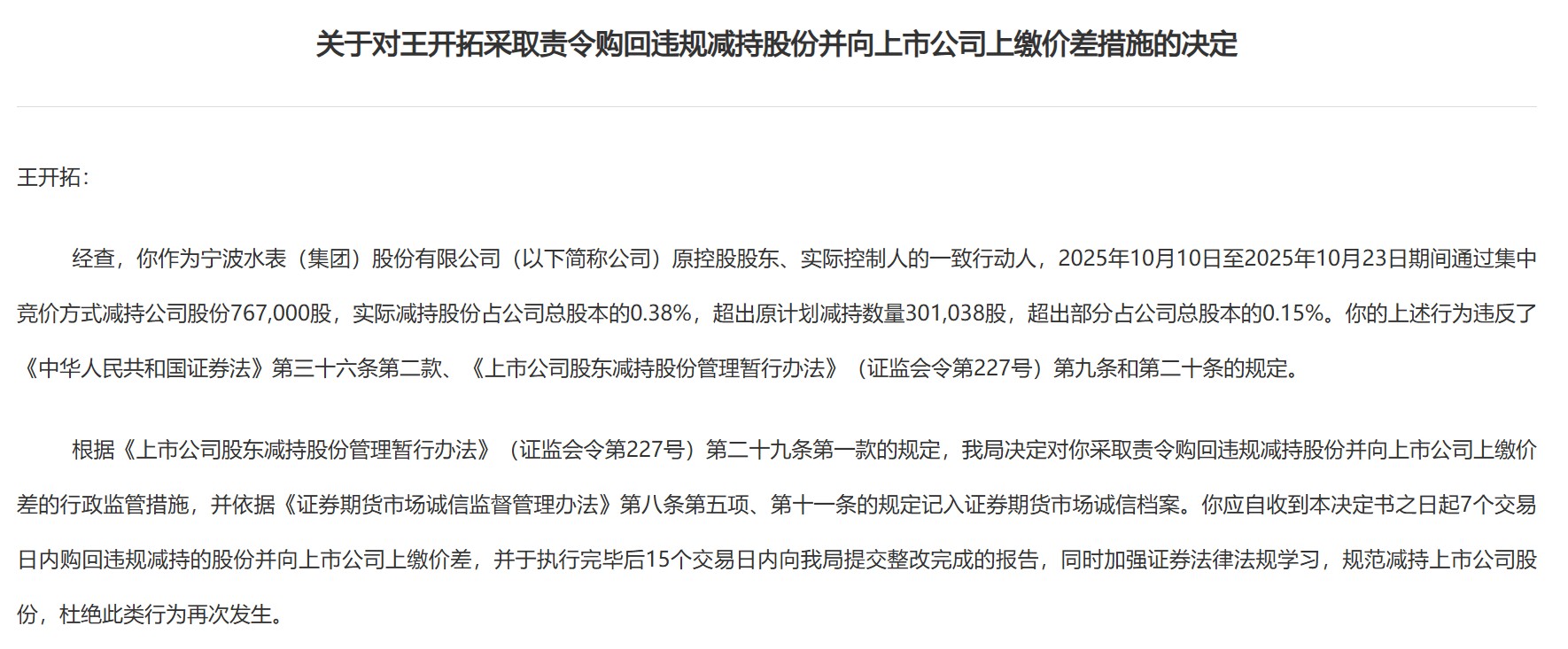 经查,王开拓作为宁波水表(集团)股份有限公司(宁水集团,A股证券代码603700,以下简称公司)原控股股东、实际控制人的一致行动人,2025年10月10日至2025年10月23日期间通过集中竞价方式减持公司股份767,000股,实际减持股份占公司总股本的0.38%,超出原计划减持数量301,038股,超出部分占公司总股本的0.15%。王开拓的上述行为违反了《证券法》第三十六条第二款、《上市公司股东减持股份管理暂行办法》第九条和第二十条的规定。