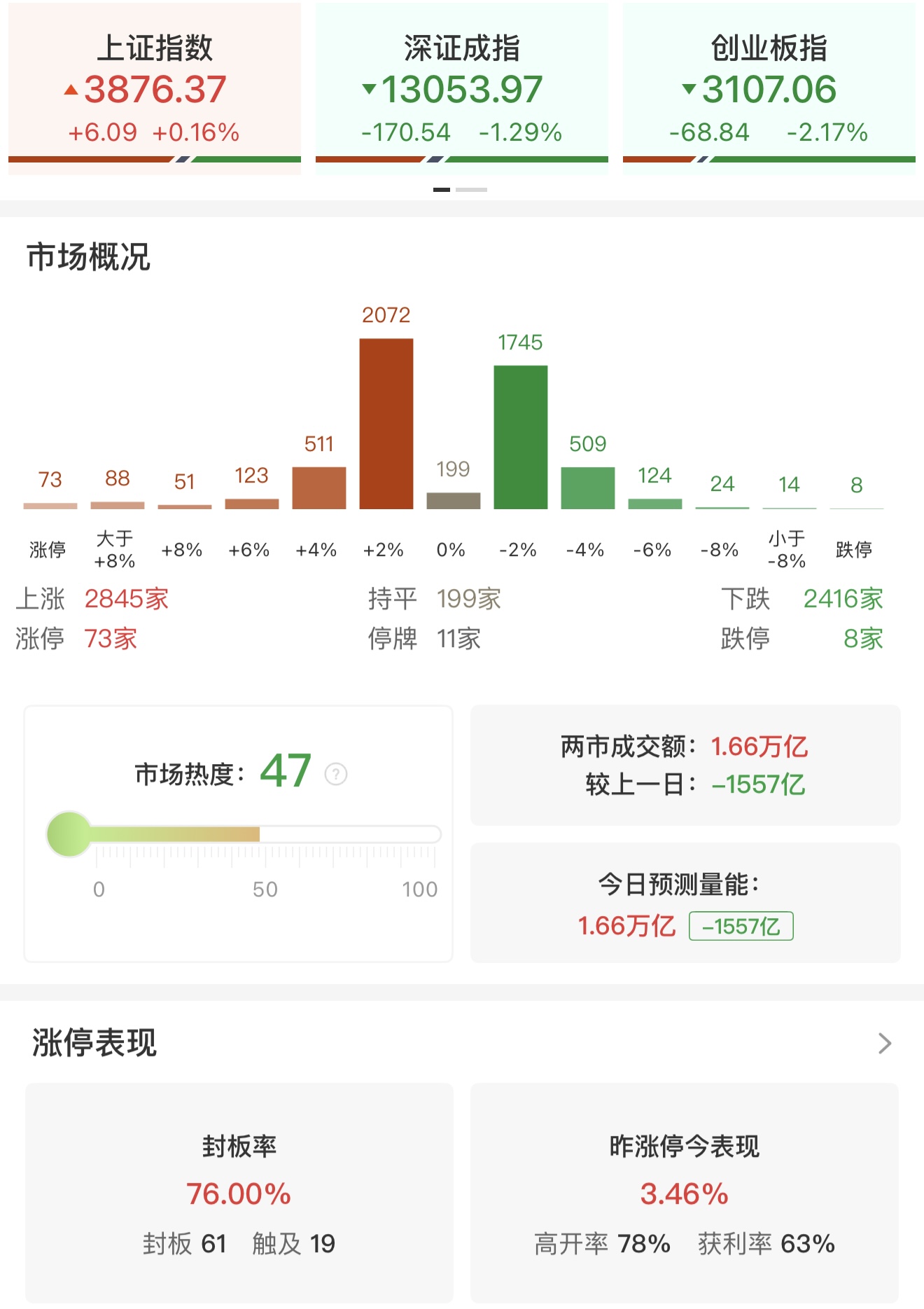 财联社12月18日电,三大指数涨跌不一,沪指低开回升,创业板指低开低走跌超2%。沪深两市成交额1.66万亿,较上一个交易日缩量1557亿。全市场近2900只个股上涨。从板块来看,银行板块震荡拉升,上海银行涨超3%,零售概念走强,中央商场、上海九百涨停。商业航天概念走势活跃,盛洋科技2连板,顺灏股份涨停。医药商业延续强势,鹭燕医药2连板,重药控股7天4板。IP经济概念表现活跃,广博股份、三湘印象涨停。下跌方面,锂电池板块回落,海科新源、华盛锂电大跌。板块方面,医药商业、银行、零售等板块涨幅居前,电池、电网设备等板块跌幅居前。截至收盘,沪指涨0.16%,深成指跌1.29%,创业板指跌2.17%。