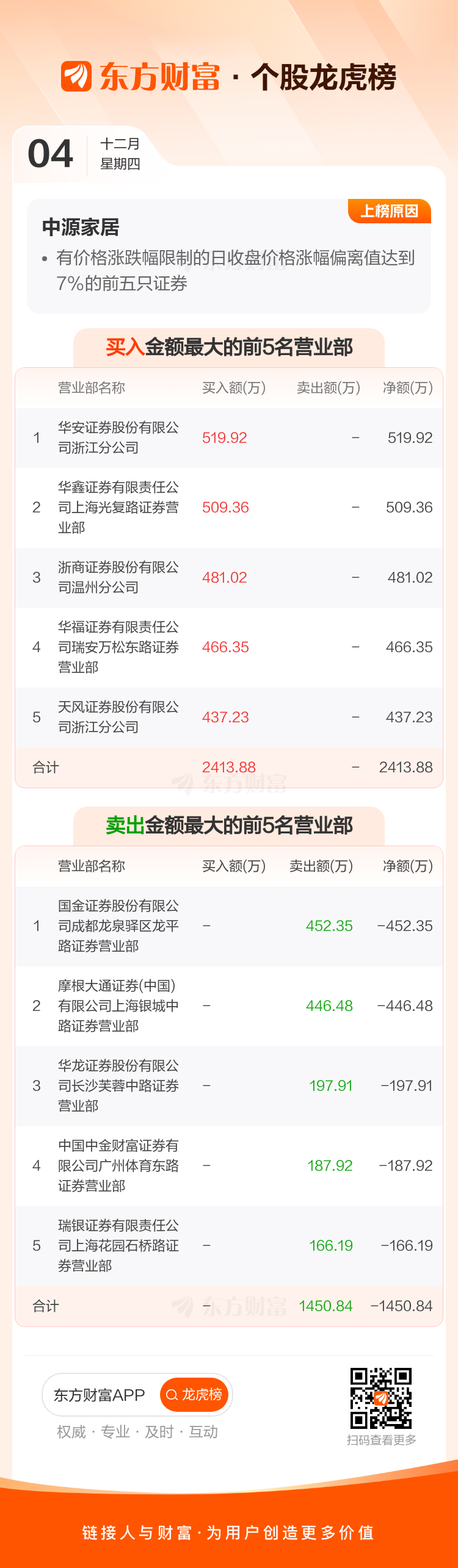 交易所2025年12月4日公布的交易公开信息显示,中源家居因成为有价格涨跌幅限制的日收盘价格涨幅偏离值达到7%的前五只证券上榜。中源家居当日收报16.57元,涨跌幅10.03%,偏离值10.08%,换手率3.63%,成交额7242.94万。