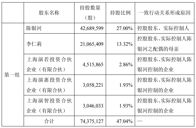 公告显示,陈银河与李仁莉为一致行动人,李仁莉为陈银河配偶的母亲。加上陈银河控制的三家合伙企业(演若、演惠、演智),一致行动人合计持股比例高达47.04%。